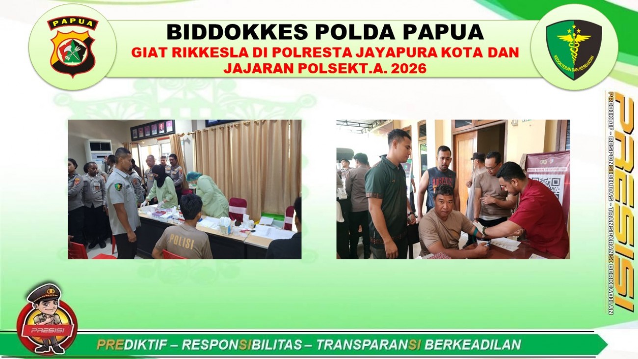 Biddokkes Polda Papua melaksanakan giat pemeriksaan kesehatan Berkala pada Polresta Jayapura Kota dan Polsek Jajaran Polresta T.A. 2026 pada hari Senin (23/02/2026 s.d. 25/02/2026).